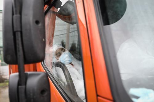 2月26日,湖北省武漢市,準(zhǔn)備進(jìn)入醫(yī)療垃圾焚燒場(chǎng)時(shí),正在等待的醫(yī)療垃圾搬運(yùn)員。中青報(bào)·中青網(wǎng)記者 趙迪/攝