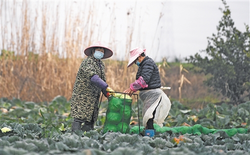 2月26日,湖北黃岡市黃州區(qū)路口鎮(zhèn)夾洲村,豐實蔬菜種植專業(yè)合作社的社員正在收蔬菜。本報記者 高興貴攝