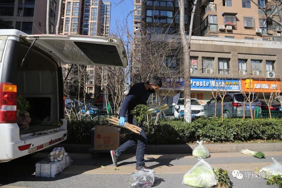 2月16日,湖北省武漢市,送菜小哥許可在為取單的小區(qū)居民擺放貨品。中國(guó)青年報(bào) 趙迪/攝