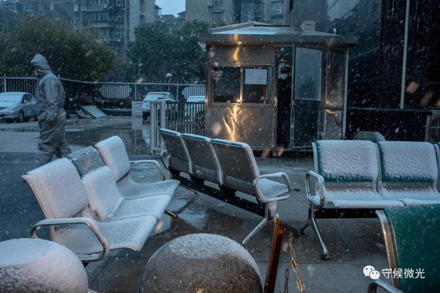 2月15日,湖北省武漢市武昌區(qū),湖北大中中醫(yī)院門前,一名工作人員經(jīng)過(guò)。椅子上已經(jīng)落了厚厚一層雪。中國(guó)青年報(bào) 李雋輝/攝