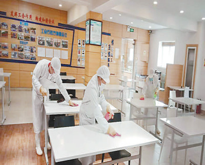 樂(lè)星汽車電子(青島)有限公司人員在對(duì)餐廳進(jìn)行嚴(yán)格消毒。王 洪攝