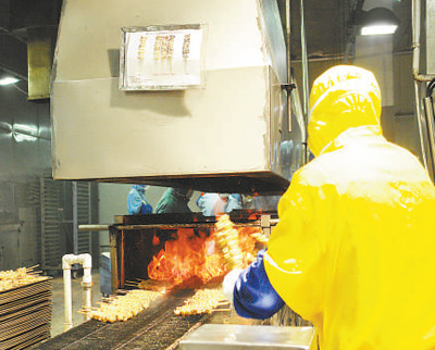 測(cè)體溫、登記、換服裝、消毒,走進(jìn)沈陽(yáng)華美食品有限公司的熟食加工車間,只見(jiàn)已經(jīng)啟動(dòng)的3條生產(chǎn)線正有條不紊運(yùn)行,300多名工人忙著給雞肉穿串、炭烤、蒸煮、速凍、包裝……一袋袋熟食“新鮮出爐”,被送入冷庫(kù)。