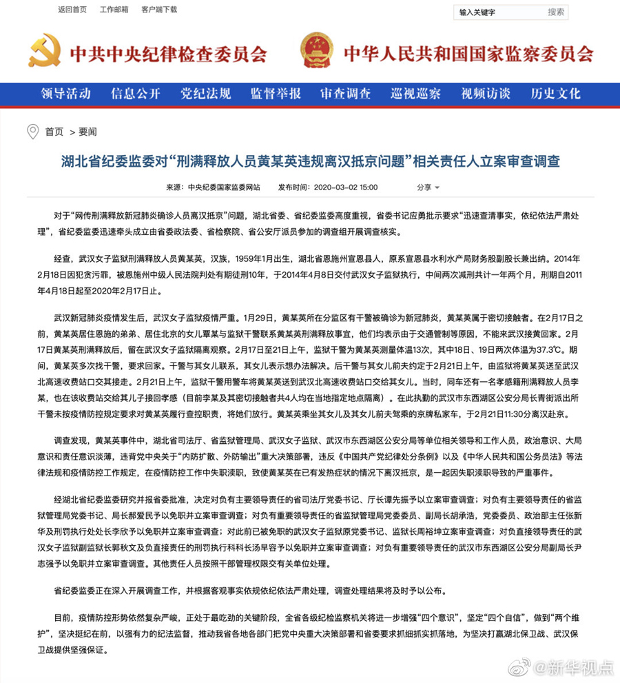 調(diào)查發(fā)現(xiàn),黃某英事件中,湖北省司法廳、省監(jiān)獄管理局、武漢女子監(jiān)獄、武漢市東西湖區(qū)公安分局等單位相關(guān)領(lǐng)導(dǎo)和工作人員,政治意識(shí)、大局意識(shí)和責(zé)任意識(shí)淡薄,違背黨中央關(guān)于“內(nèi)防擴(kuò)散、外防輸出”重大決策部署,違反《中國(guó)共產(chǎn)黨紀(jì)律處分條例》以及《中華人民共和國(guó)公務(wù)員法》等法律法規(guī)和疫情防控工作規(guī)定,在疫情防控工作中失職瀆職,致使黃某英在已有發(fā)熱癥狀的情況下離漢抵京,是一起因失職瀆職導(dǎo)致的嚴(yán)重事件。