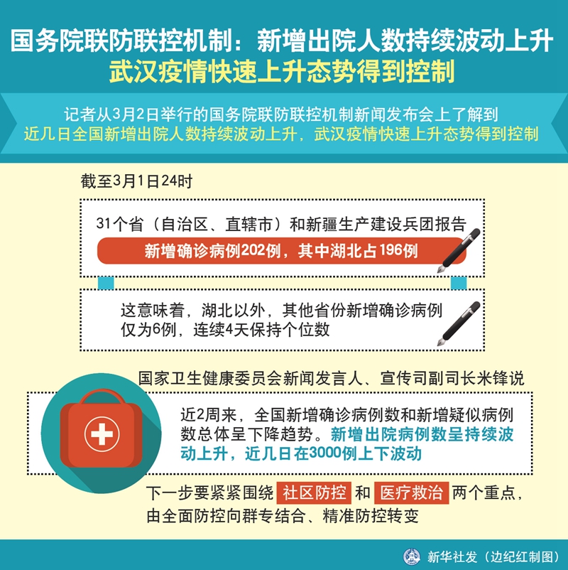 ? 新華社北京3月2日電(記者屈婷、周瑋)記者從2日舉行的國務(wù)院聯(lián)防聯(lián)控機制新聞發(fā)布會上了解到,近幾日全國新增出院人數(shù)持續(xù)波動上升,武漢疫情快速上升態(tài)勢得到控制。