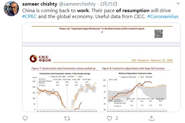 推特用戶sameer chishty說:中國正在復(fù)工復(fù)產(chǎn)。他們的這一步伐將驅(qū)動全球經(jīng)濟增長。