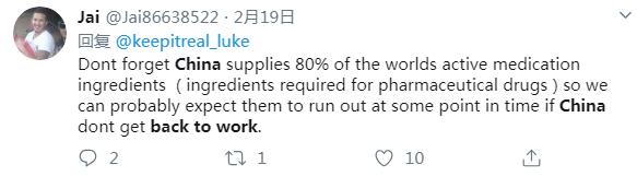 推特用戶Jai說:不要忘了中國供應(yīng)著全世界80%的活性藥物成分,因此如果中國不復(fù)工復(fù)產(chǎn),它們可能會在某個時間點用完。