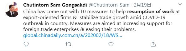 推特用戶Chutintorn Sam Gongsakdi說:在應(yīng)對新冠肺炎疫情期間,中國出臺了10項措施來幫助出口企業(yè)復(fù)工復(fù)產(chǎn),并推動貿(mào)易的穩(wěn)定增長。這些措施旨在加強對外貿(mào)企業(yè)的支持,并解決它們面臨的問題。