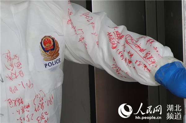 穿著這件“絕版防護(hù)服”的,正是湖北荊州市公安局沙市區(qū)分局勝利街派出所所長(zhǎng)代睿?!白o(hù)目鏡起霧視線模糊,又怕漏掉居民的需求,只好寫在防護(hù)服上。我的手臂上寫的都是急需的藥品等物資,胸前和腿上寫的是急需的生活用品?!贝Uf(shuō),這樣記錄方便也能看的清。