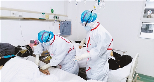 奮戰(zhàn)在武漢金銀潭醫(yī)院南一區(qū)的國家中醫(yī)醫(yī)療隊大夫們正在為患者診治。(資料照片)