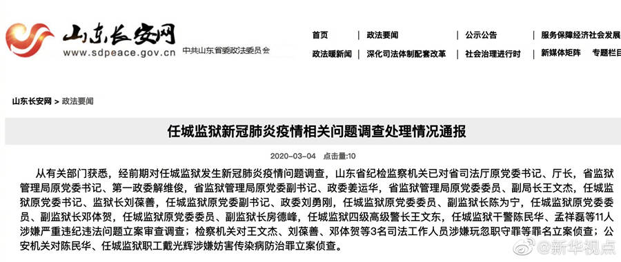 從有關(guān)部門獲悉,經(jīng)前期對任城監(jiān)獄發(fā)生新冠肺炎疫情問題調(diào)查,山東省紀(jì)檢監(jiān)察機(jī)關(guān)已對省司法廳原黨委書記、廳長,省監(jiān)獄管理局原黨委書記、第一政委解維俊,省監(jiān)獄管理局原黨委副書記、政委姜運(yùn)華,省監(jiān)獄管理局原黨委委員、副局長王文杰,任城監(jiān)獄原黨委書記、監(jiān)獄長劉葆善,任城監(jiān)獄原黨委副書記、政委劉勇剛,任城監(jiān)獄原黨委委員、副監(jiān)獄長陳為寧,任城監(jiān)獄原黨委委員、副監(jiān)獄長鄧體賀,任城監(jiān)獄原黨委委員、副監(jiān)獄長房德峰,任城監(jiān)獄四級高級警長王文東,任城監(jiān)獄干警陳民華、孟祥磊等11人涉嫌嚴(yán)重違紀(jì)違法問題立案審查調(diào)查;檢察機(jī)關(guān)對王文杰、劉葆善、鄧體賀等3名司法工作人員涉嫌玩忽職守罪等罪名立案偵查;公安機(jī)關(guān)對陳民華、任城監(jiān)獄職工戴光輝涉嫌妨害傳染病防治罪立案偵查。