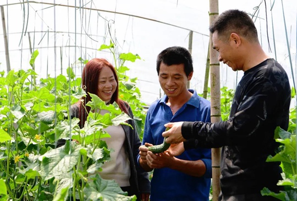 福建省建甌市小橋鎮(zhèn)的鄉(xiāng)鎮(zhèn)干部下鄉(xiāng)為農(nóng)戶講解大棚黃瓜的種植與管理技術(shù) 魏培全 攝