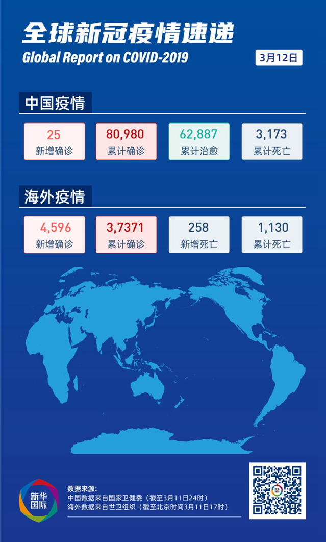 意大利全國范圍實施“封城”;法國、西班牙確診病例突破兩千;伊朗啟動國家動員計劃……世衛(wèi)組織報告顯示,截至北京時間11日17時,中國以外有113個國家和地區(qū)報告確診病例37371例,死亡1130例。