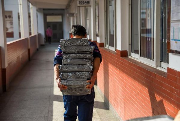 還有一個(gè)家長(zhǎng)幫忙背書(shū)搬運(yùn)