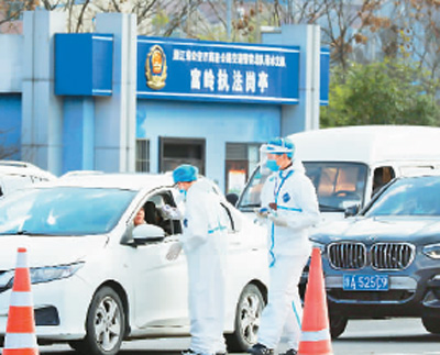 醫(yī)護人員在浙江省麗水市麗龍高速公路富嶺收費站出口為來往人員測體溫。陳英亞攝