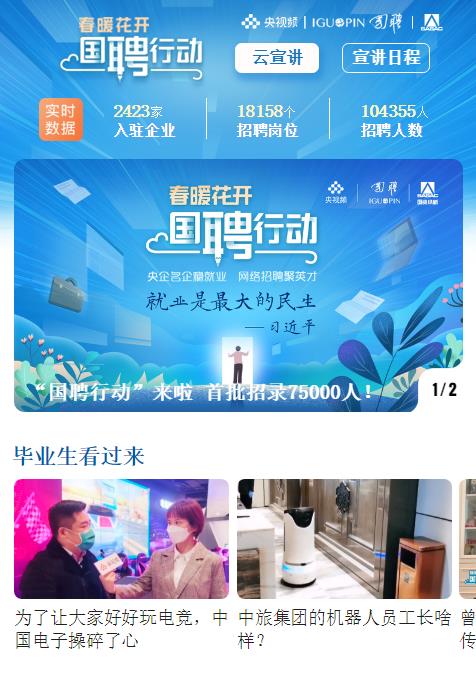 由中央廣播電視總臺(tái)“央視頻”攜手國(guó)投集團(tuán),與國(guó)務(wù)院國(guó)資委共同推出的大型線上招聘活動(dòng)——“春暖花開 國(guó)聘行動(dòng)”自3月2日啟動(dòng)以來,企業(yè)踴躍參與,求職者紛紛投遞簡(jiǎn)歷、尋找機(jī)遇。截至目前,中央企業(yè)和知名民企先后舉辦了18場(chǎng)網(wǎng)絡(luò)招聘“云宣講”,面向社會(huì)提供了超10萬個(gè)招聘職位,累計(jì)入駐企業(yè)近2500家。