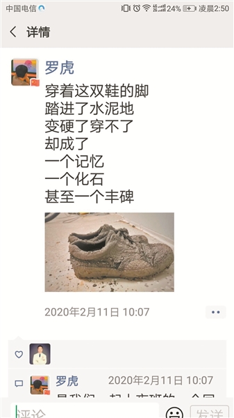 第二天,同為重癥醫(yī)學(xué)一科軍醫(yī)的羅虎聽(tīng)聞戰(zhàn)友的“趣聞”后,專門為那雙已經(jīng)風(fēng)干的42碼迷彩鞋拍了一張照片,還配詩(shī)一首。