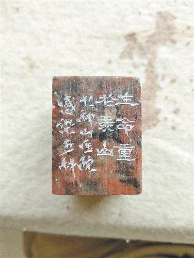 這是一塊普通的壽山石,篆刻上“生命重于泰山”,便成一方印章。