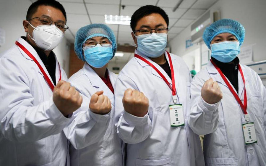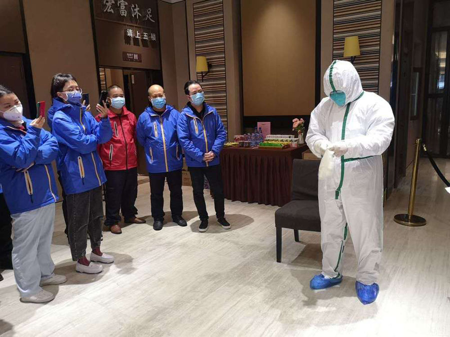 圖為四川大學華西醫(yī)院援湖北醫(yī)療隊朱仕超(右二)與同事相互鼓勵打氣。