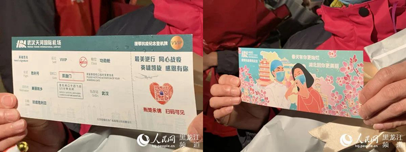 公寶霞是黑龍江省第五批援鄂醫(yī)療隊(duì)隊(duì)員,作為首批凱旋回鄉(xiāng)的醫(yī)護(hù)人員,她格外興奮?!澳康牡貙懼利惖墓枢l(xiāng)’,航班號是‘勝利號’,艙位是‘功勛艙’。”公寶霞說,這是武漢天河機(jī)場專門為他們準(zhǔn)備的紀(jì)念登機(jī)牌,特別有意義。