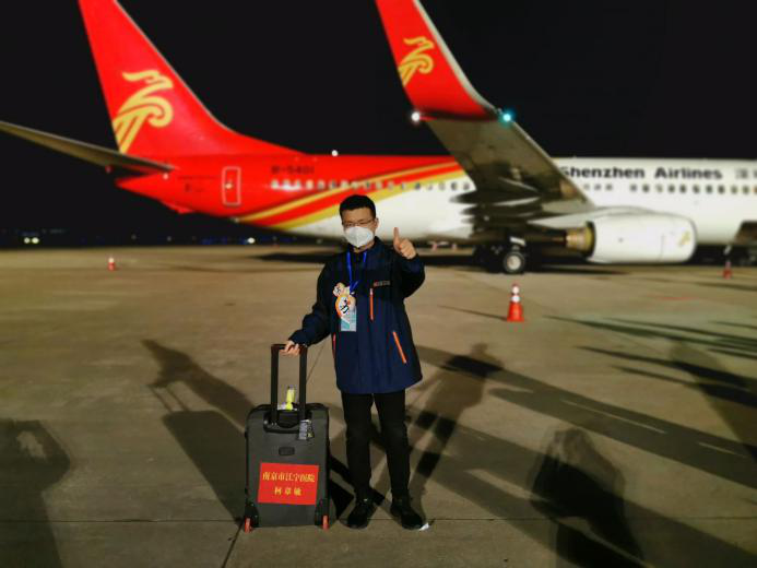 3月17日晚,柯章敏結(jié)束50多天的支援,從武漢乘坐飛機(jī)抵達(dá)南京祿口機(jī)場。受訪者供圖