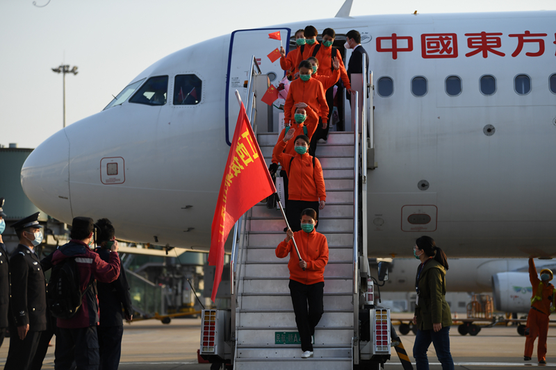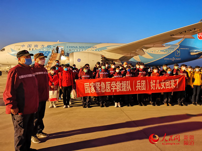 新疆生產(chǎn)建設(shè)兵團(tuán)支援湖北醫(yī)療隊(duì)抵達(dá)烏魯木齊機(jī)場。陳新輝攝