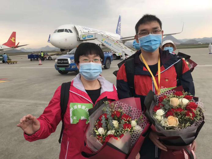 貴州省援鄂醫(yī)療隊(duì)隊(duì)員王艷(左一)平安返黔。開陽宣傳部供圖