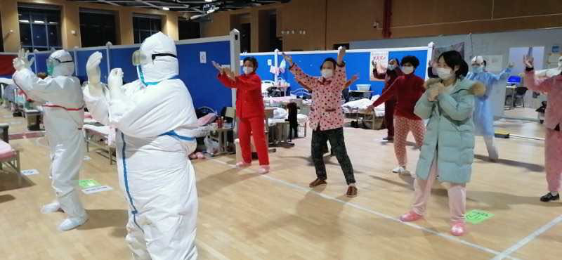 青海醫(yī)護(hù)人員帶領(lǐng)患者們一起做運(yùn)動。青海省支援湖北護(hù)理醫(yī)療隊(duì)供圖