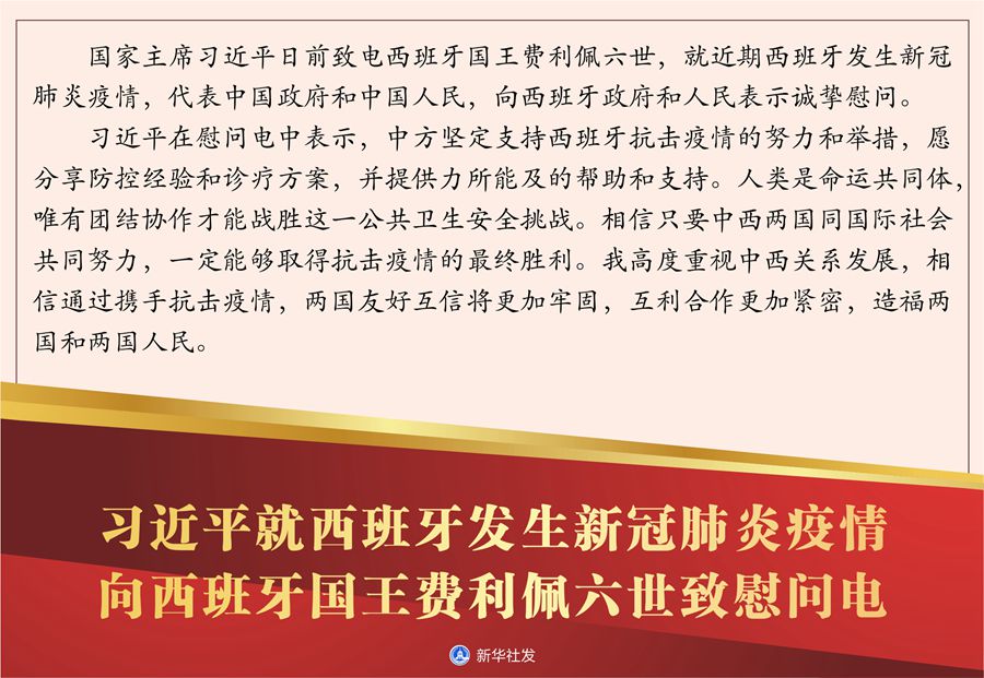 習(xí)近平在慰問電中表示,中方堅(jiān)定支持西班牙抗擊疫情的努力和舉措,愿分享防控經(jīng)驗(yàn)和診療方案,并提供力所能及的幫助和支持。人類是命運(yùn)共同體,唯有團(tuán)結(jié)協(xié)作才能戰(zhàn)勝這一公共衛(wèi)生安全挑戰(zhàn)。相信只要中西兩國同國際社會(huì)共同努力,一定能夠取得抗擊疫情的最終勝利。我高度重視中西關(guān)系發(fā)展,相信通過攜手抗擊疫情,兩國友好互信將更加牢固,互利合作更加緊密,造福兩國和兩國人民。