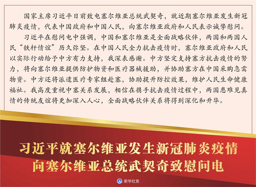 新華社北京3月21日電 國(guó)家主席習(xí)近平日前致電塞爾維亞總統(tǒng)武契奇,就近期塞爾維亞發(fā)生新冠肺炎疫情,代表中國(guó)政府和中國(guó)人民,向塞爾維亞政府和人民表示誠(chéng)摯慰問(wèn)。