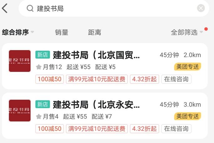 在外賣平臺上搜索可以發(fā)現(xiàn),不同書店標(biāo)注的起送價格不同,同時也會顯示店面與用戶的距離,以及需要的配送時間等信息。