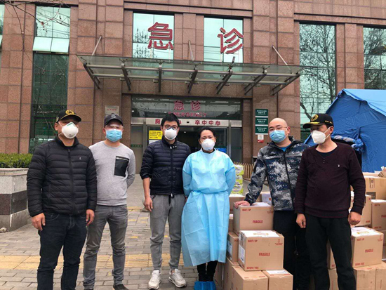 武漢市中心醫(yī)院醫(yī)生接收志愿者送去的物資。
