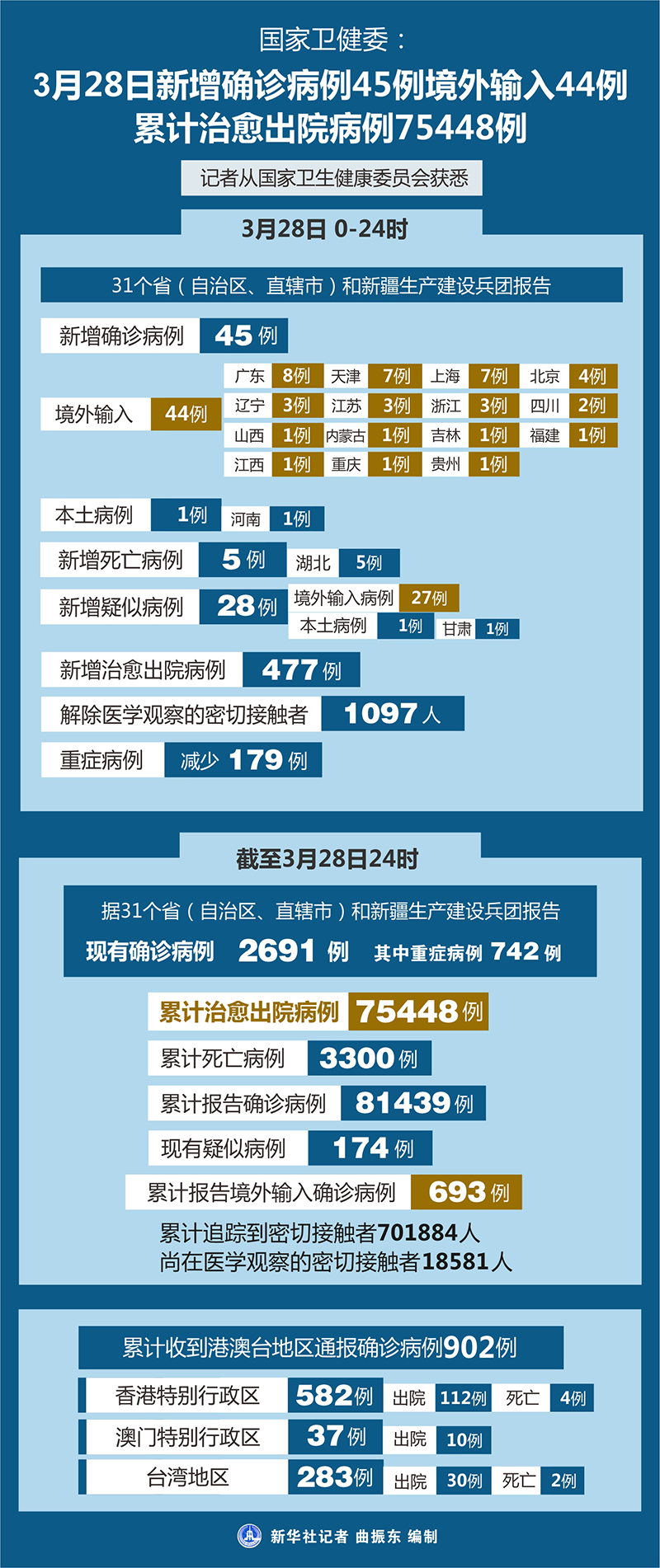 截至3月28日24時,據31個?。ㄗ灾螀^(qū)、直轄市)和新疆生產建設兵團報告,現有確診病例2691例(其中重癥病例742例),累計治愈出院病例75448例,累計死亡病例3300例,累計報告確診病例81439例,現有疑似病例174例。累計追蹤到密切接觸者701884人,尚在醫(yī)學觀察的密切接觸者18581人。