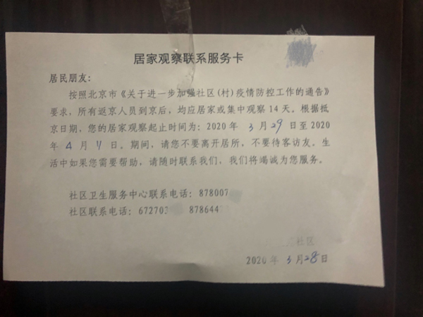 8、交接:車輛到達(dá)社區(qū)后,隨行的街道干部同社區(qū)工作人員進(jìn)行交接。返京人員在測(cè)量體溫、簽署《居家觀察個(gè)人告知書(shū)》等文件后,由社區(qū)工作人員送至家中。居家觀察的14天內(nèi),將嚴(yán)格禁止外出、會(huì)客等行為,由社區(qū)安排專人幫助解決生活困難。