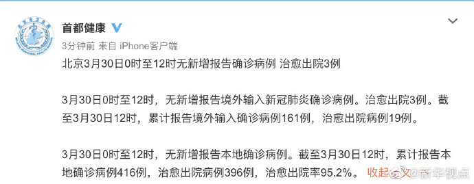 3月30日0時至12時,無新增報告境外輸入新冠肺炎確診病例。治愈出院3例。截至3月30日12時,累計報告境外輸入確診病例161例,治愈出院病例19例。