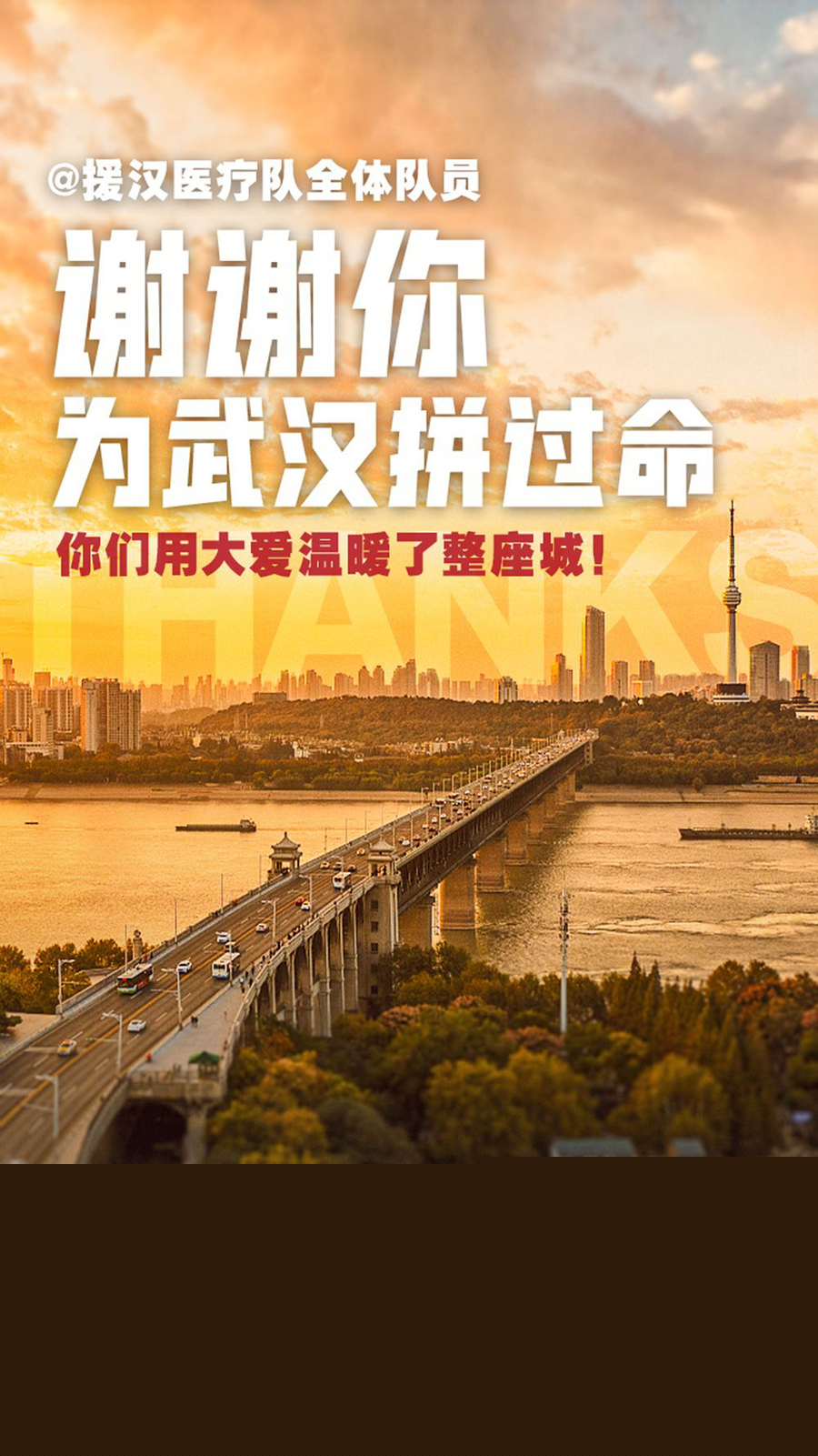 患難相扶,生死與共。在這幾十天里,你們與武漢人民心手相連、生死相依,從死神手中搶回了一條條生命、拯救了一個(gè)個(gè)家庭。忘不了你們從祖國(guó)四面八方馳援武漢時(shí),口中喊出的“武漢加油!中國(guó)加油!”;忘不了你們穿著防護(hù)裝備走進(jìn)病房,握著患者的手說“別怕,有我們?cè)冢 ?;忘不了你們臉上被面罩勒出的一道道印痕;更忘不了你們摘掉口罩后露出美麗迷人的笑容!“沒有生而英勇,只是選擇無畏”,感謝你們?cè)谖錆h人民遭遇疫情的困難時(shí)刻,迎難而上、沖鋒在前,以命搏命、舍命相助,用大愛溫暖了整座城!因?yàn)槟銈兊牡絹恚錆h更多患者得到了及時(shí)有效的救治;因?yàn)槟銈兊牡絹恚錆h才這么快地迎來了疫情防控斗爭(zhēng)的勝利曙光;因?yàn)槟銈兊牡絹?,武漢才有了今天的穩(wěn)定和安寧。你們是最大的功臣!是新時(shí)代最可愛的人!武漢人民永遠(yuǎn)銘記你們的恩情!