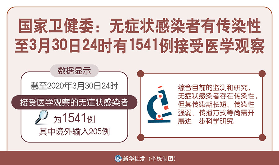 新華社北京3月31日電(記者王秉陽)國家衛(wèi)健委31日在官網(wǎng)發(fā)布《關(guān)于新型冠狀病毒無癥狀感染者的防控工作答問》,對(duì)近來網(wǎng)民熱議的無癥狀感染者相關(guān)問題進(jìn)行回答。數(shù)據(jù)顯示,截至2020年3月30日24時(shí),接受醫(yī)學(xué)觀察的無癥狀感染者為1541例,其中境外輸入205例。