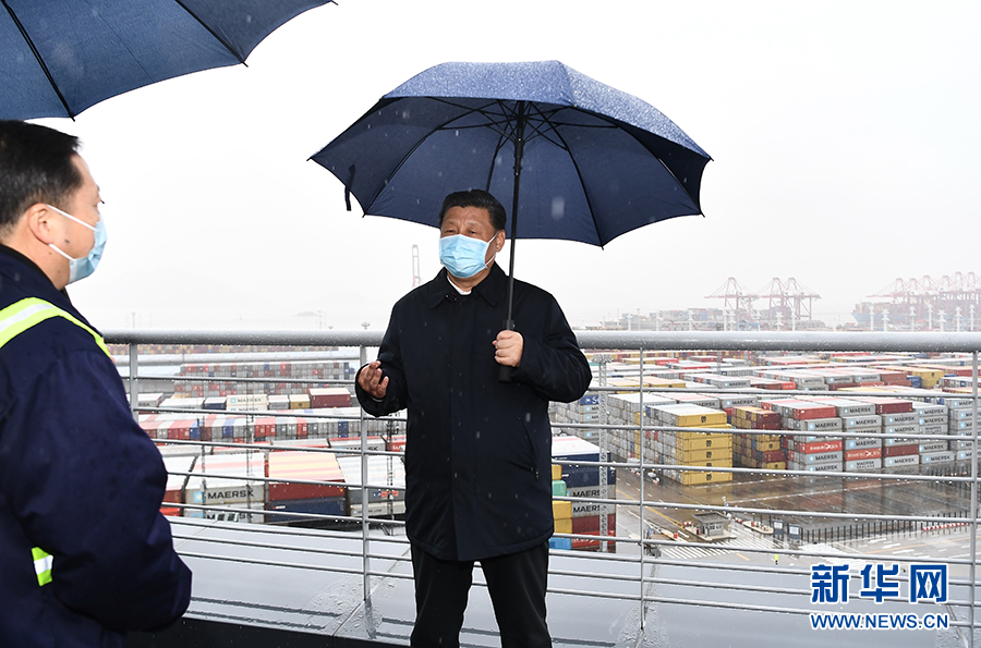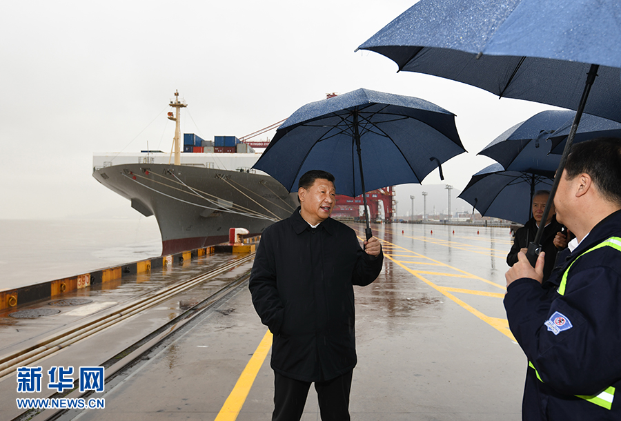 3月29日,中共中央總書記、國家主席、中央軍委主席習(xí)近平在浙江考察調(diào)研。這是習(xí)近平在寧波舟山港穿山港區(qū)碼頭了解港口復(fù)工復(fù)產(chǎn)情況。 新華社記者 燕雁 攝