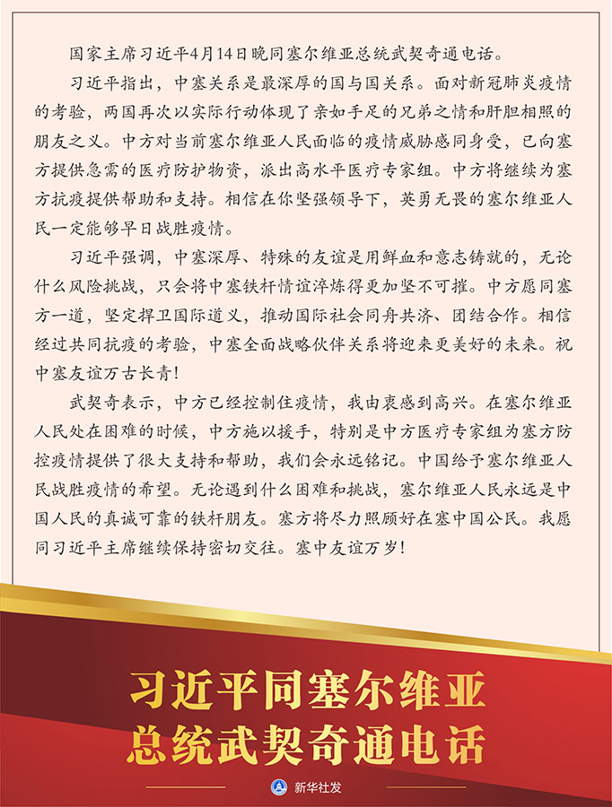 習近平指出,中塞關系是最深厚的國與國關系。面對新冠肺炎疫情的考驗,兩國再次以實際行動體現(xiàn)了親如手足的兄弟之情和肝膽相照的朋友之義。中方對當前塞爾維亞人民面臨的疫情威脅感同身受,已向塞方提供急需的醫(yī)療防護物資,派出高水平醫(yī)療專家組。中方將繼續(xù)為塞方抗疫提供幫助和支持。相信在你堅強領導下,英勇無畏的塞爾維亞人民一定能夠早日戰(zhàn)勝疫情。