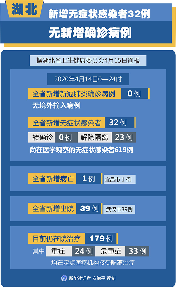 新華社武漢4月15日電(記者李偉、王作葵)據(jù)湖北省衛(wèi)生健康委員會15日通報,2020年4月14日0—24時,全省新增新冠肺炎確診病例0例,無境外輸入病例。全省新增無癥狀感染者32例,轉(zhuǎn)確診0例,解除隔離23例,尚在醫(yī)學(xué)觀察的無癥狀感染者619例。