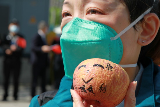 4月12日,北京協(xié)和醫(yī)療隊所負責的ICU患者清零,張媛媛松了一口氣,此時從北京帶來的蘋果已經枯萎皺皮,她便在上面畫了一張笑臉,寫下“勝利”二字。她說,能夠把這個蘋果帶回家,意味著隊伍平安返京,而作為堅守到最后的醫(yī)療隊,她們的撤離標志著武漢的抗疫工作獲得了重大階段性勝利。