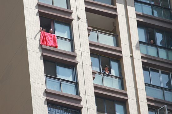 今天的歡送現(xiàn)場,多位志愿者和市民自發(fā)前來。今天的武漢陽光明媚,在北京協(xié)和醫(yī)院醫(yī)療隊駐地酒店旁邊的居民樓上,有市民在陽臺上掛出“保重”兩個大字,不少市民朝著醫(yī)療隊揮舞國旗,其中一戶市民拿著一床紅色的被子在陽臺上不斷抖動,為醫(yī)療隊送行。