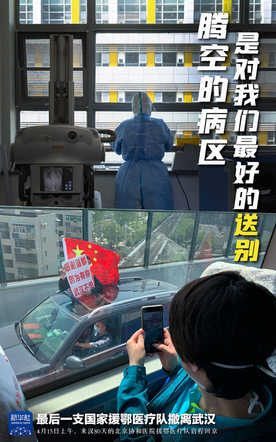 這一刻,湖北人民依依不舍。北京協(xié)和醫(yī)療隊的撤離,標志著全國各地340多支援鄂國家醫(yī)療隊全部離鄂、離漢。同一天,30多公里外的雷神山醫(yī)院也結(jié)束救治任務(wù)宣告“封山”。