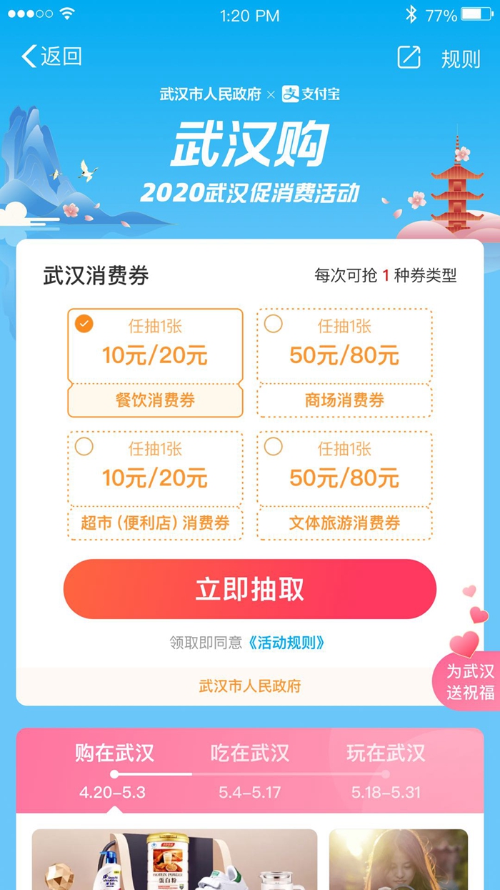 根據(jù)安排,“武漢消費(fèi)券”將在阿里巴巴、美團(tuán)點(diǎn)評(píng)、騰訊等3家企業(yè)自有線上平臺(tái)上按周投放,總體投放分兩期執(zhí)行。其中,第一期為4月19日至5月31日,首次投放活動(dòng)將在4月19日中午12時(shí)進(jìn)行,在漢人員可登錄支付寶、美團(tuán)、大眾點(diǎn)評(píng)、微信等手機(jī)程序,搜索“武漢”“消費(fèi)券”等關(guān)鍵詞進(jìn)入活動(dòng)頁面參與領(lǐng)券。第二期為6月1日至7月31日,具體投放時(shí)間另行公布。