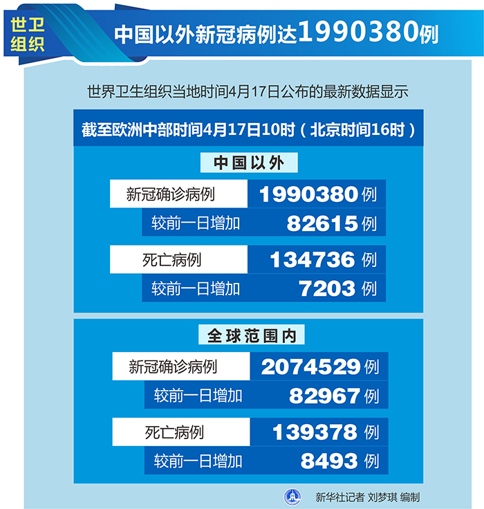 新華社日內(nèi)瓦4月17日電(記者劉曲)世界衛(wèi)生組織17日公布的最新數(shù)據(jù)顯示,中國以外新冠確診病例達(dá)到1990380例。