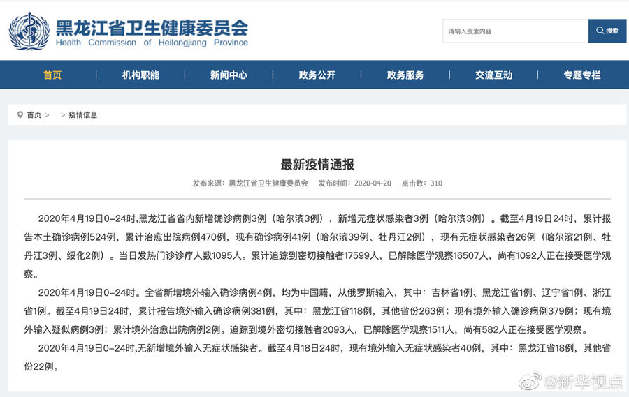 2020年4月19日0-24時,黑龍江省省內新增確診病例3例(哈爾濱3例),新增無癥狀感染者3例(哈爾濱3例)。截至4月19日24時,累計報告本土確診病例524例,累計治愈出院病例470例,現(xiàn)有確診病例41例(哈爾濱39例、牡丹江2例),現(xiàn)有無癥狀感染者26例(哈爾濱21例、牡丹江3例、綏化2例)。當日發(fā)熱門診診療人數(shù)1095人。累計追蹤到密切接觸者17599人,已解除醫(yī)學觀察16507人,尚有1092人正在接受醫(yī)學觀察。