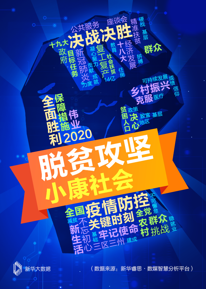 總書記的牽掛,也是網(wǎng)民的關(guān)注。新華睿思持續(xù)跟蹤微博、抖音、今日頭條等網(wǎng)上熱搜榜高熱話題,以及重大新聞事件,梳理出網(wǎng)民關(guān)注的熱詞集錦。根據(jù)關(guān)注度排行可以看出,“脫貧攻堅”“小康社會”兩大關(guān)鍵詞位居前列,“決戰(zhàn)決勝”“全面勝利”“疫情防控”等也成為熱搜詞匯。