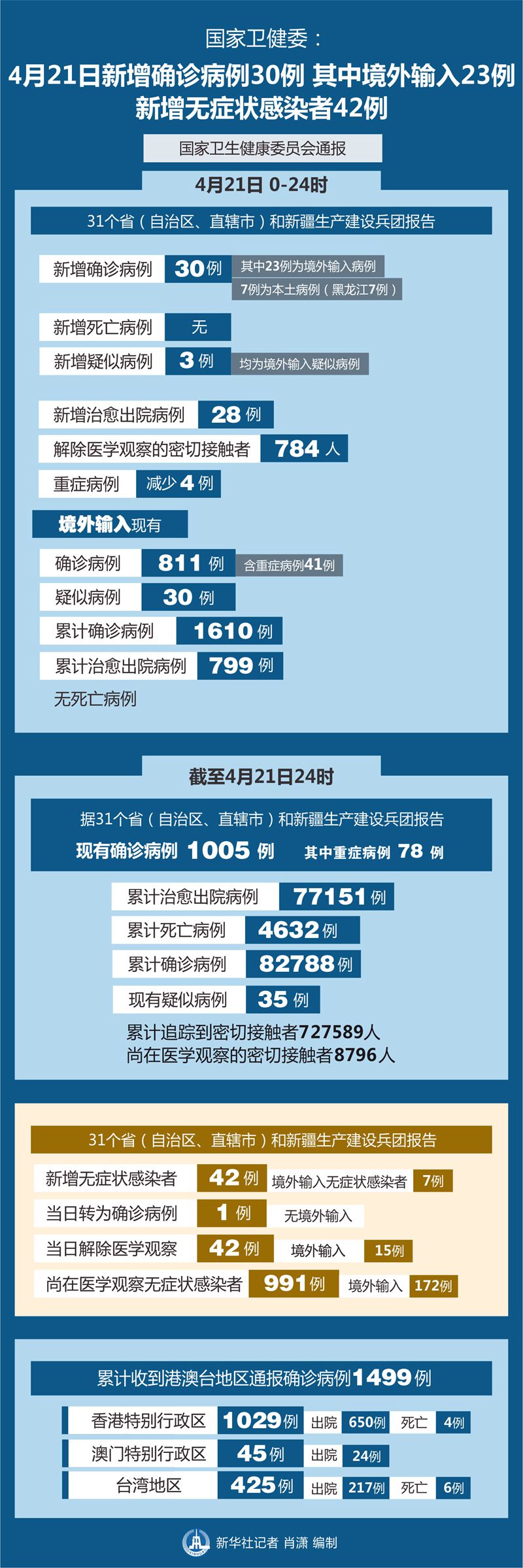 新華社北京4月22日電(記者劉紅霞、溫競華)國家衛(wèi)健委22日通報,4月21日0-24時,31個省(自治區(qū)、直轄市)和新疆生產建設兵團報告新增確診病例30例,其中23例為境外輸入病例,7例為本土病例(黑龍江7例);無新增死亡病例;新增疑似病例3例,均為境外輸入疑似病例。