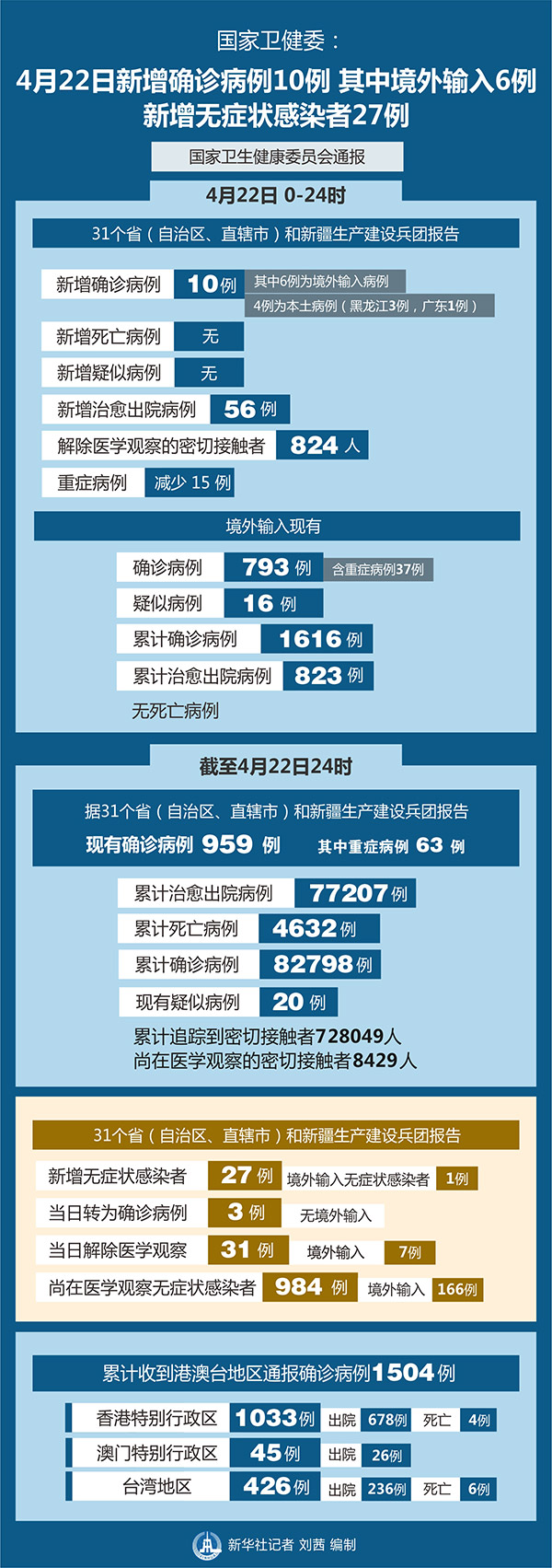 截至4月22日24時,據(jù)31個?。ㄗ灾螀^(qū)、直轄市)和新疆生產(chǎn)建設(shè)兵團報告,現(xiàn)有確診病例959例(其中重癥病例63例),累計治愈出院病例77207例,累計死亡病例4632例,累計報告確診病例82798例,現(xiàn)有疑似病例20例。累計追蹤到密切接觸者728049人,尚在醫(yī)學觀察的密切接觸者8429人。