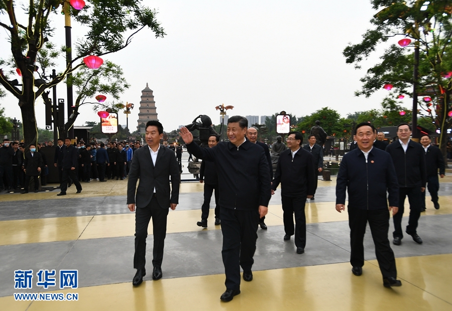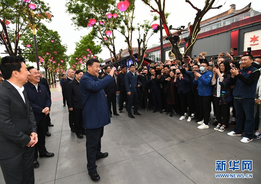 4月20日至23日,中共中央總書記、國家主席、中央軍委主席習(xí)近平在陜西考察。這是4月22日,習(xí)近平在西安大唐不夜城步行街考察時,向游客揮手致意。 新華社記者 謝環(huán)馳 攝