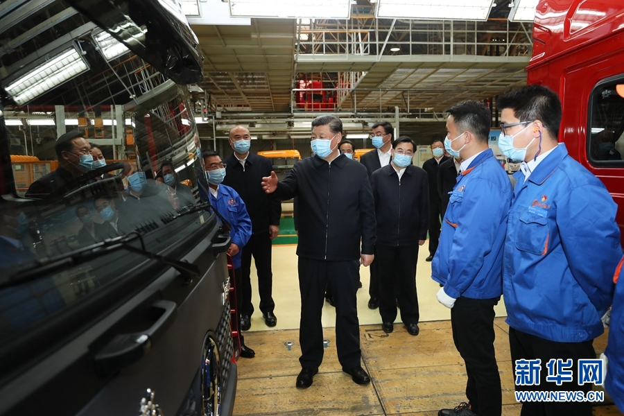 22日,習(xí)近平在西安考察復(fù)工復(fù)產(chǎn)和經(jīng)濟社會恢復(fù)運行等情況。陜西汽車控股集團有限公司是西北地區(qū)有影響力的制造企業(yè)。習(xí)近平詳細了解產(chǎn)品研發(fā)、生產(chǎn)、銷售和復(fù)工復(fù)產(chǎn)情況,對他們克服疫情影響創(chuàng)產(chǎn)銷歷史新高表示贊賞。總裝車間內(nèi)一片繁忙景象。習(xí)近平察看內(nèi)飾生產(chǎn)線、總裝配生產(chǎn)線,饒有興致登上裝配完成的民用重型卡車駕駛室,向技術(shù)人員詢問產(chǎn)品性能和操作流程。習(xí)近平強調(diào),制造業(yè)是國家經(jīng)濟命脈所系。國有大型企業(yè)要發(fā)揮主力軍作用,在抓好常態(tài)化疫情防控的前提下,帶動上下游產(chǎn)業(yè)和中小企業(yè)全面復(fù)工復(fù)產(chǎn)。習(xí)近平指出,新時代陜西要有勇立潮頭、爭當(dāng)時代弄潮兒的志向和氣魄,既要抓住西部大開發(fā)、共建“一帶一路”等重大機遇,又要善于從眼前的危機和挑戰(zhàn)中搶抓和創(chuàng)造機遇,不斷發(fā)展新模式、新業(yè)態(tài)、新技術(shù)、新產(chǎn)品,創(chuàng)造新的更大業(yè)績,邁上新的臺階。